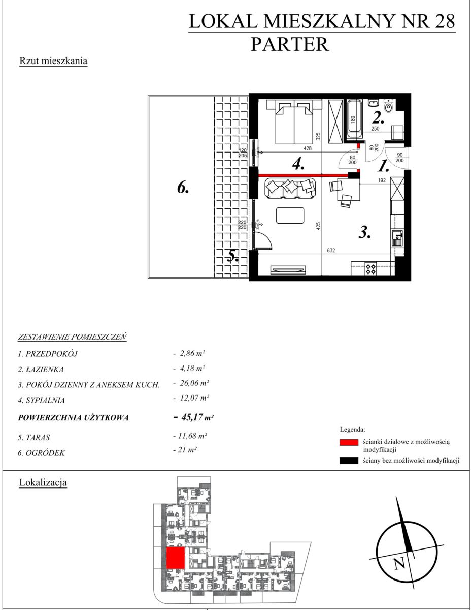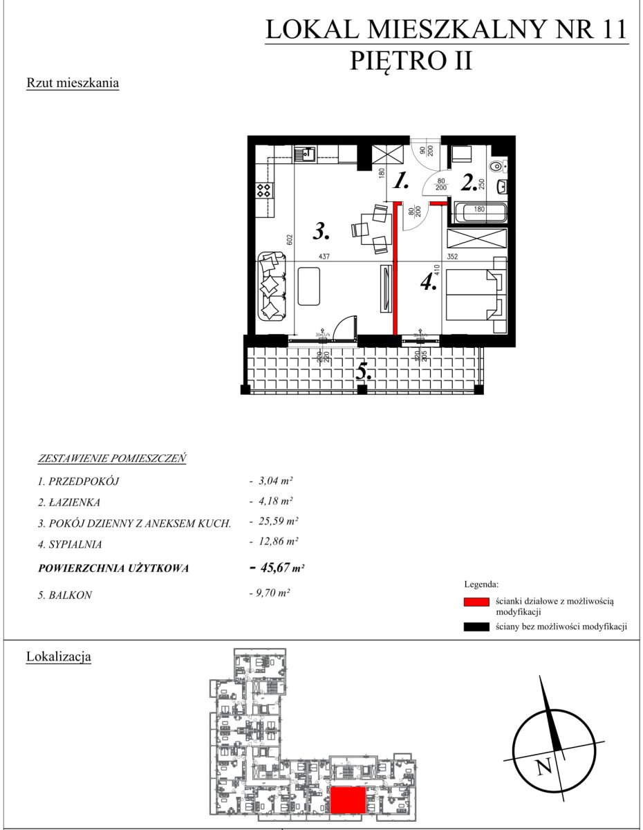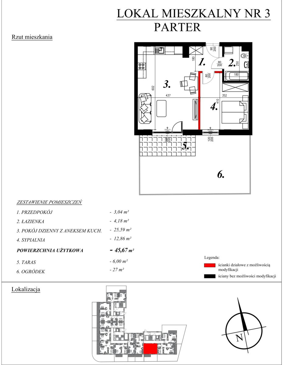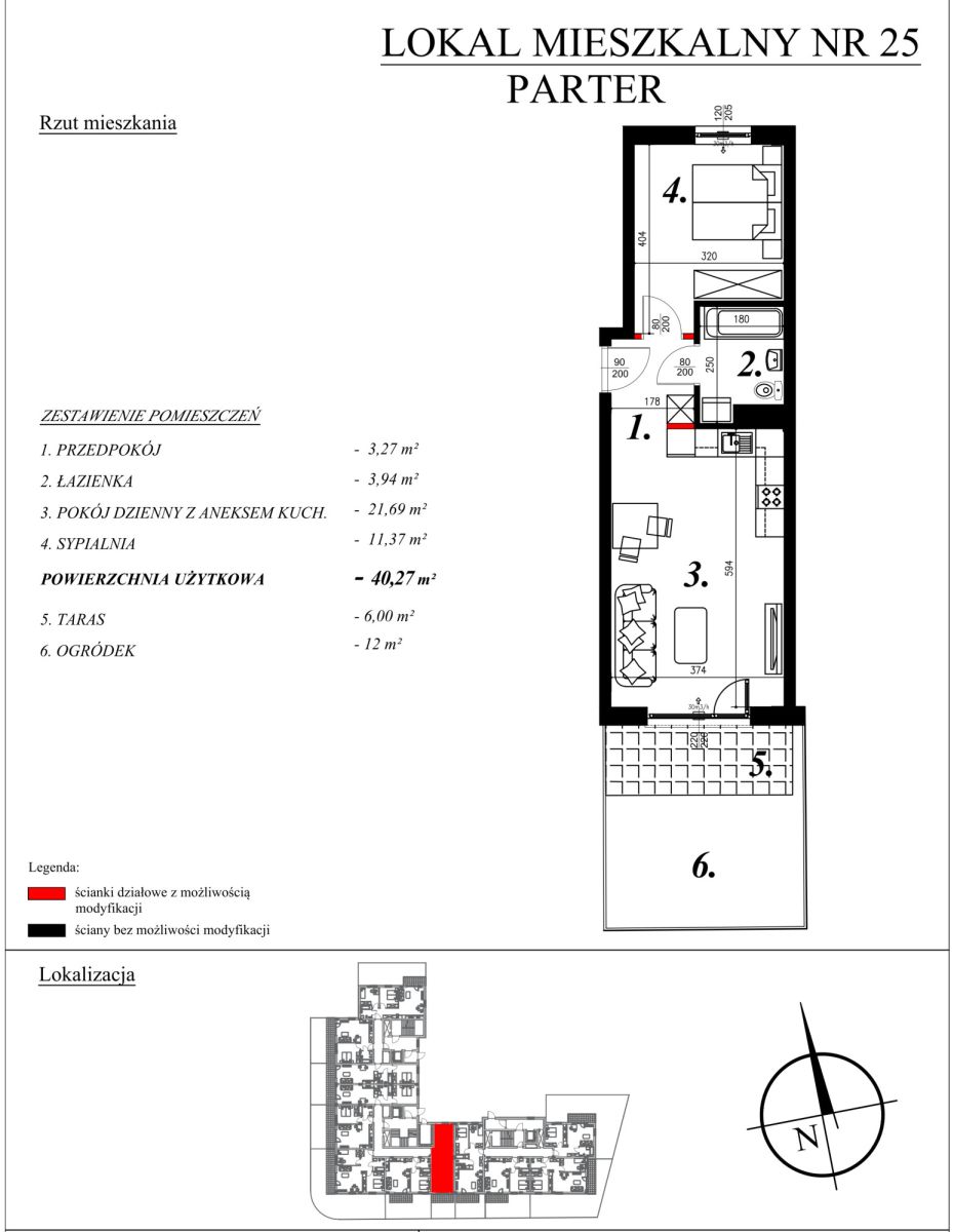 O mieszkaniach:W ofercie posiadamy nowe mieszkania o powierzchni od 40,27m² do 46,26m², w skład których wchodzą:
